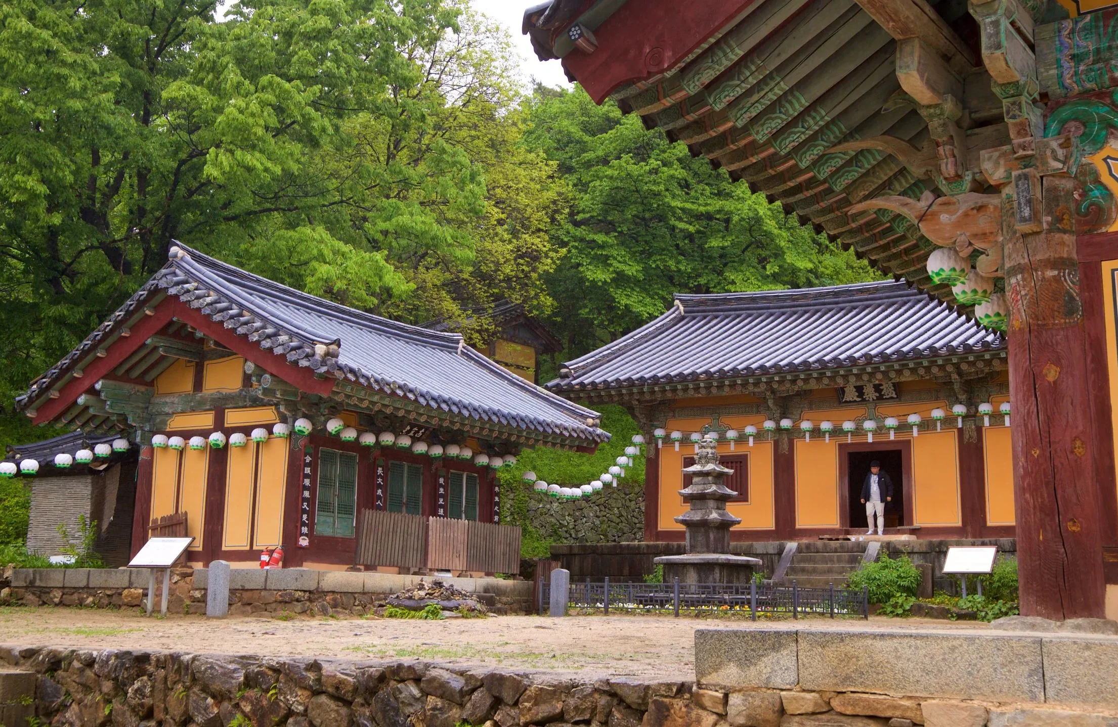 Templo budista en las montañas, con la sala de madera más antigua de Corea (Geungnakjeon). Patrimonio, paz y arquitectura tradicional en un solo lugar.