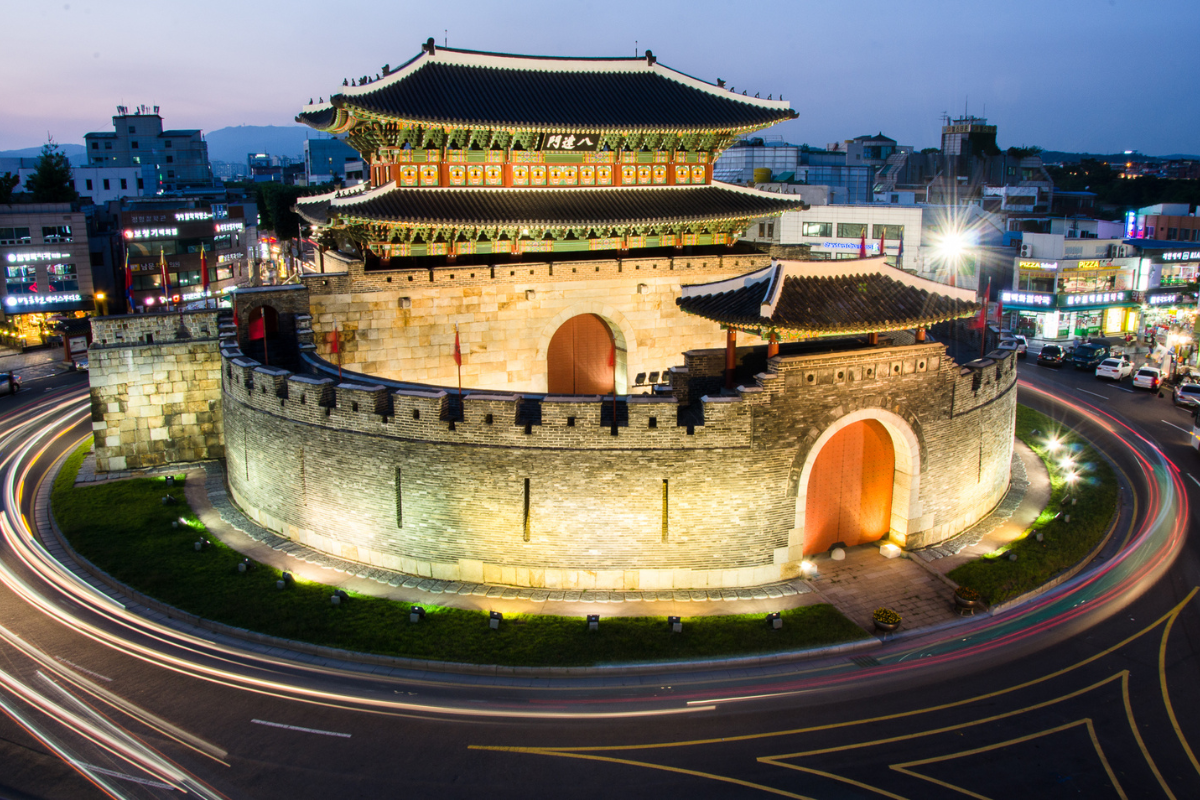 La puerta sur de la fortaleza y una de las más fotografiadas de Suwon. Este imponente portal de dos pisos servía como entrada principal a la ciudad amurallada y hoy preside una animada zona comercial tradicional.